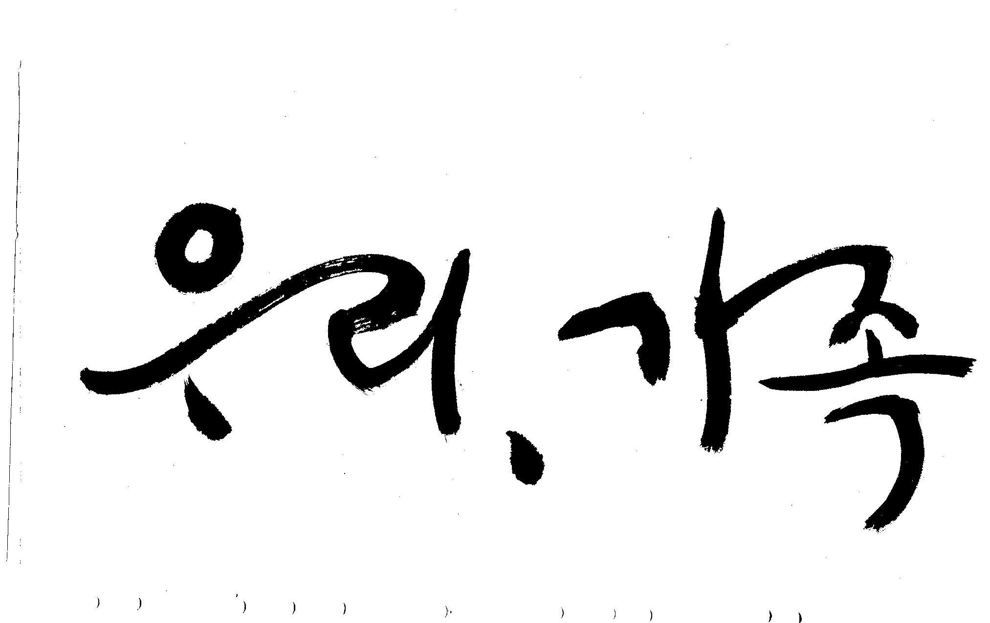 기축년 신년 으뜸말 휘호 김철호 일반 0 4844 2009.01.02 20:21 어떤 으뜸말이 올해엔 필요할까... 고민하다가.. 언제나 그랬듯이 어려울때에는 무엇보다도 우리라는 공동체의 가치관이 더 필요할것 같고 가족이라는 최소의 가치가 (여기서 최소라고 하는것은 가치를 말하는 것이 아니고 가장기본적인 단위를 말하는 것입니다.) 무엇보다도 앞서야 한다고 느꼈으므로 "우리"와 "가족"을 주제어로 정했습니다. 이것은 무조건 내 생각입니다. 다른분들은 다른 주제어가 있겠죠... 어쨌든지 ... 새해엔 행복하고 건강하세요..